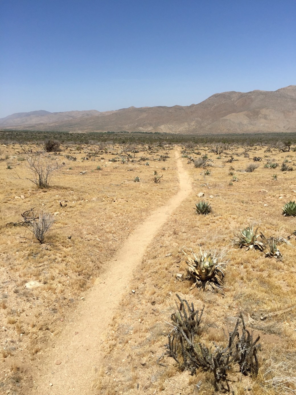 It was a 15 mile day to Scissors Crossing, which is a fancy name for a place the PCT crosses a back road. The trail was the most Barron so far. Very open desert with spiny cactus and something called Goathead Thorns which to hear the locals talk are armor piercing.