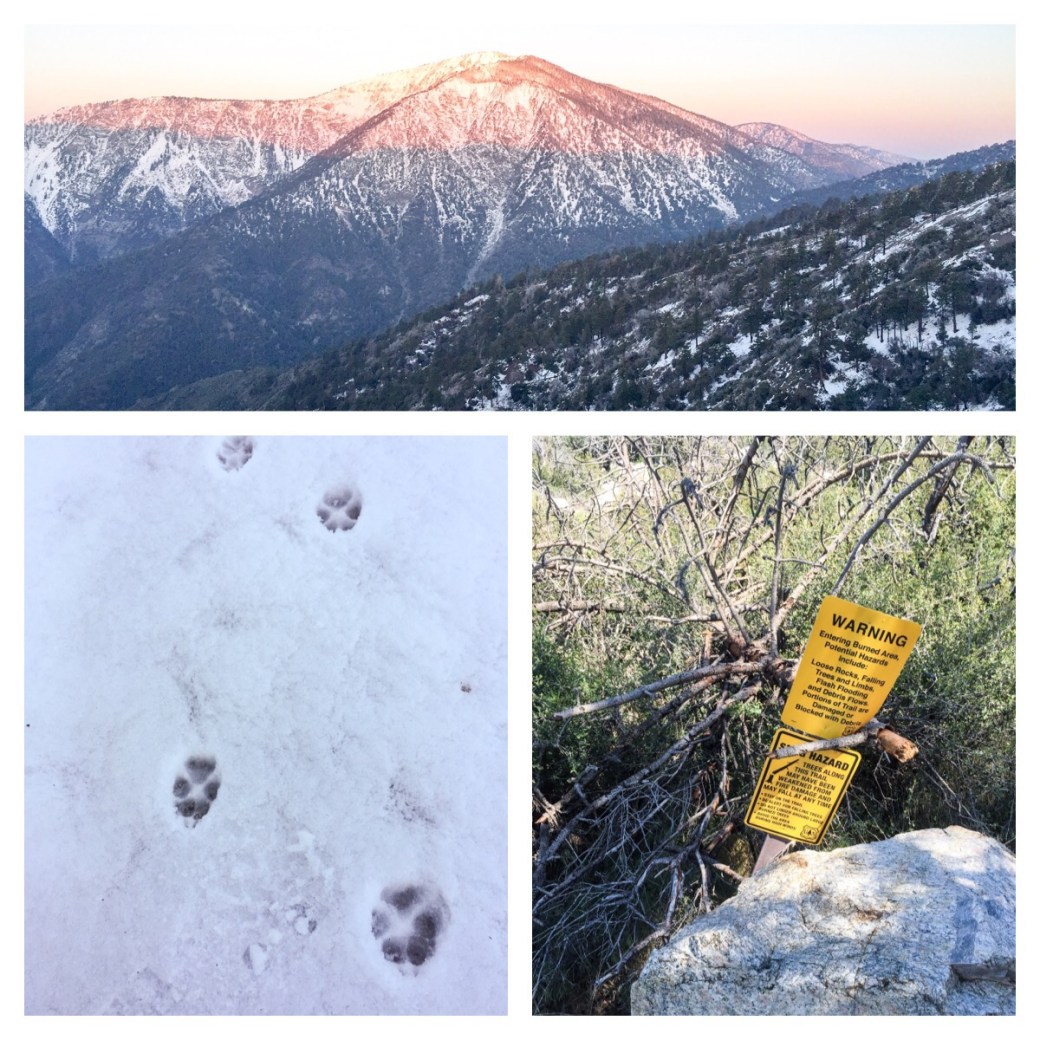 Pictures! The top is the last goodbye to Mt. Baten Powell. The left are Coyote tracks in the snow. (Mountain Lions show no claws). The right is the definition of irony: the sign warning for falling trees gets clobbered by a falling tree. π