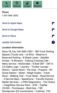 To the right is a screenshot of a TA truck stop. Lots of info, including the No RV overnight parking. But when I need a hot meal they usually have something.