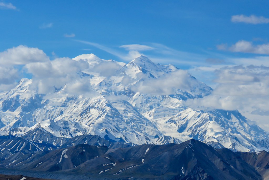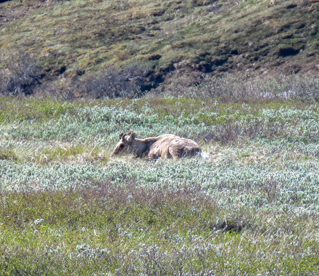 On Tuesday I took the bus just 66 miles to the Eielson Visitor center; a 3 1/2 hour ride. It was still fun and I could see many Moose, (Meese?) Caribou, and wild Dall Sheep. No Bears or Wolves, though. The weather cleared for ONE DAY I did finally got some pictures of Denali! The mountain is often so shrouded in clouds that there is a “30%” chance you’ll see the peaks. Well, the clouds briefly broke and I got the two peaks. Not the whole mountain, tho. 😦 So no 30% badge for me…