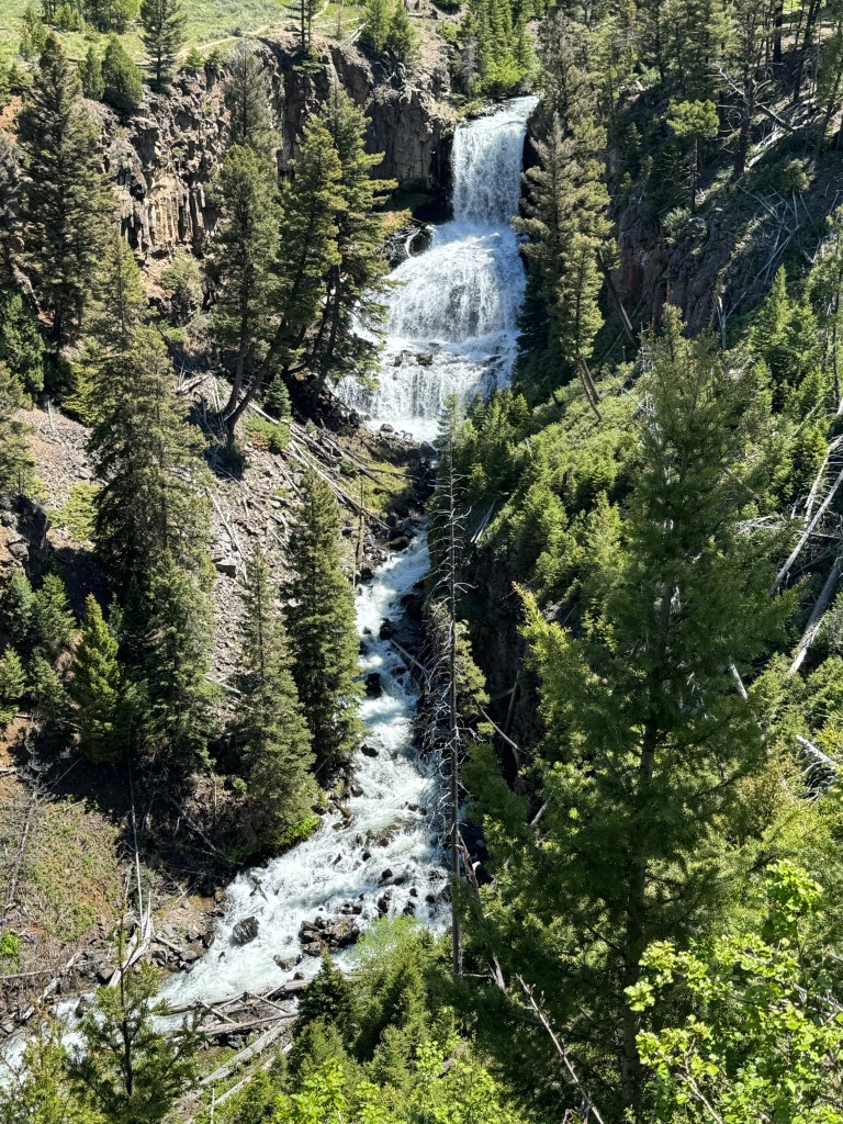 And, I stopped to see the famous Tower Falls. It rates its own gift shop. The falls were just OK from the overlook, but there was a side trail that looked like it would have a better view. I joined more than a few people trudging almost a mile down to the River. (300-500 ft elevation loss) Aaaand, nope. No view. 🤬