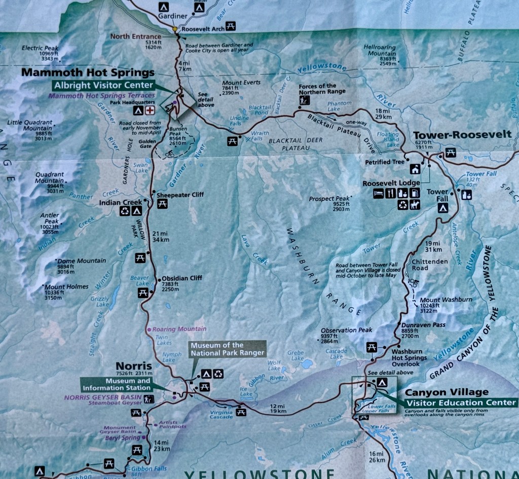 The road is one big loop through northern and N-central Yellowstone ending back at Canyon Village. The topography changes quite a bit. The West and South parts of the park are very much River meadows, while the north is more alpine. The east is more high plains/high desert.